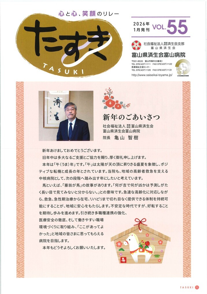 Home 病院案内 広報誌 広報誌「たすき」 広報誌「たすき」Vol.55 2026年1月 病院案内 広報誌「たすき」Vol.55 2026年1月 広報誌「たすき」 Vol.55 2026年1月発刊 新年のごあいさつ (p.1) 医療福祉支援センターの紹介 / 皮膚科の紹介(p.2) 栄養管理科の紹介 / 救急看護認定看護師の活動・救急センターについて(p.3) 当院にご紹介いただく先生方へ(p.4) 広報誌「たすき」Vol.55を見る