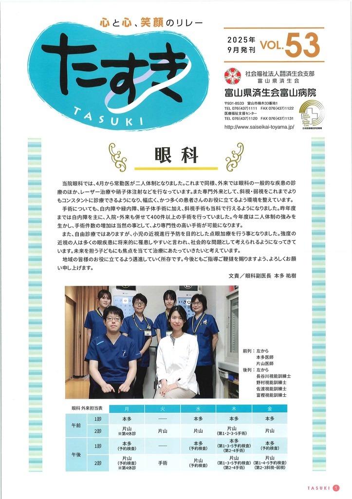 Home 病院案内 広報誌 広報誌「たすき」 広報誌「たすき」Vol.53 2025年9月 病院案内 広報誌「たすき」Vol.53 2025年9月 広報誌「たすき」 Vol.53 2025年9月発刊 眼科のご紹介 (p.1) 放射線技術科の紹介 / がん看護専門看護師の取り組み(p.2) 倫理コンサルテーションチームの取り組み / 院長コラム vol.2(p.3) 当院にご紹介いただく先生方へ(p.4) 広報誌「たすき」Vol.53 を見る