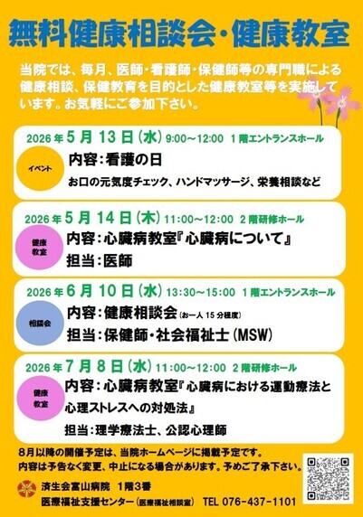 当院では、毎月 医師・看護師・保健師の専門職による健康相談、保健教育などの相談会を実施しています。お気軽にご参加ください。