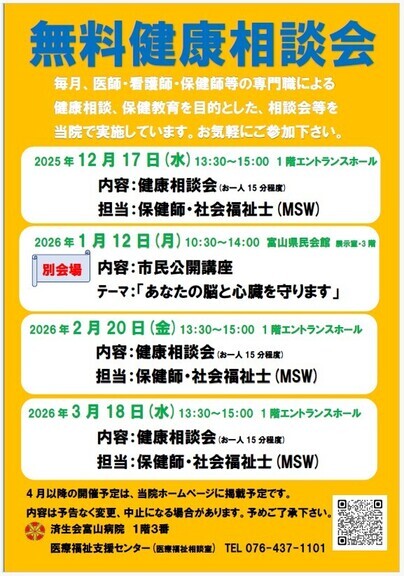 場 所 : 済生会富山病院 1階エントランスホール 3番 患者相談窓口(月~金 8:30~17:30)