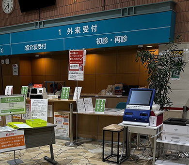 「1番外来受付窓口」にて受付- 予約をされている方は診察券をご準備の上、「自動再来受付機」をご利用ください